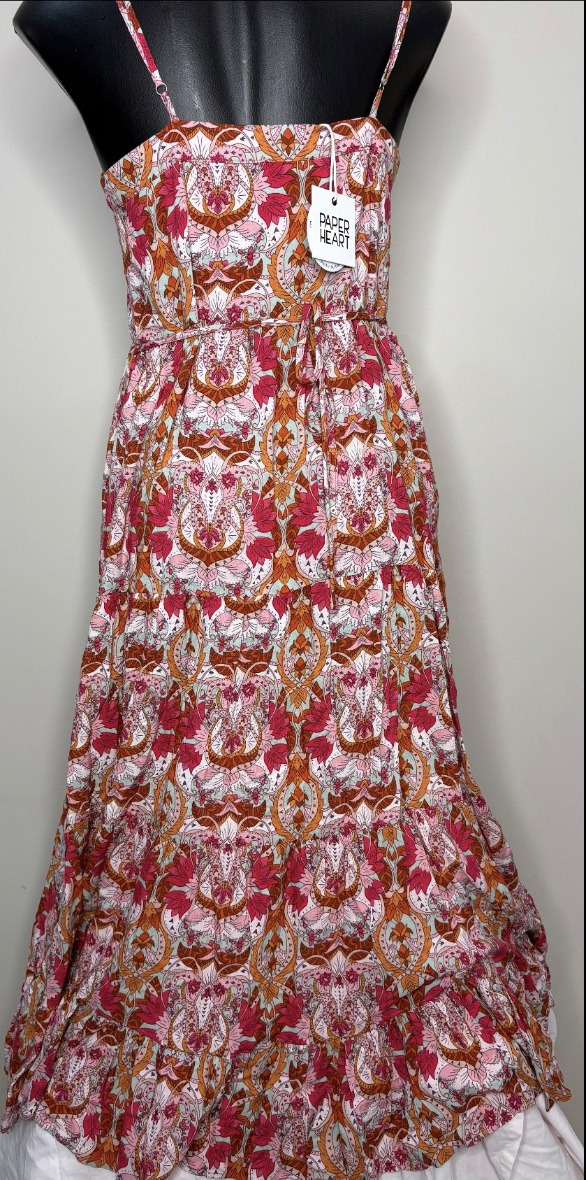 The Arnhem Boho Vintage Apricot & Blue Petite Floral Dress in size 8 is a sun-warmed, romantic piece that blends vintage-inspired charm with modern, sustainable sensibility.
